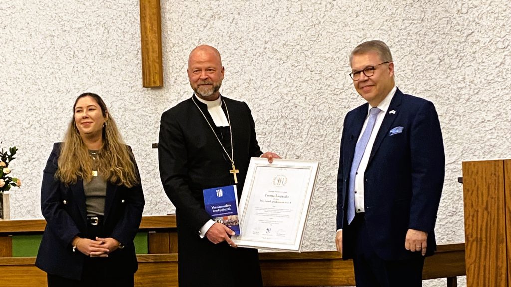 Suomi-Israel Yhdistysten Liiton puheenjohtaja Risto Huvila sekä liiton varapuheenjohtaja Shirel Siiri Levi luovuttivat Pro Israel -palkinnon Helsingin hiippakunnan piispalle Teemu Laajasalolle