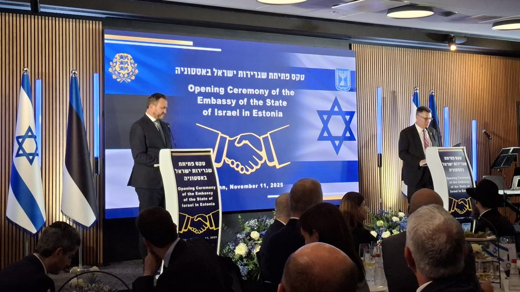 Viron ulkoministeri Margus Tsahkna ja Israelin ulkoministeri Gideon Sa’ar puhuivat Israelin suurlähetystön avajaisjuhlallisuuksissa Radisson Collection -hotellissa Tallinnassa 11.11.2025